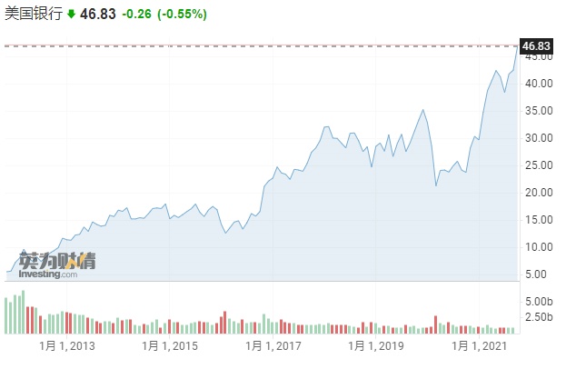 其中,10月21日,美国银行盘内创历史新高达46.83美元,收盘回吐部分涨幅达46.83美元,收跌0.55%。