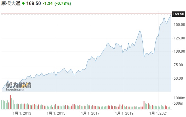 同日,摩根大通股价盘内接近历史记录171.51美元,高达171.32美元,收盘回吐部分涨幅达169.5美元,收跌0.78%。