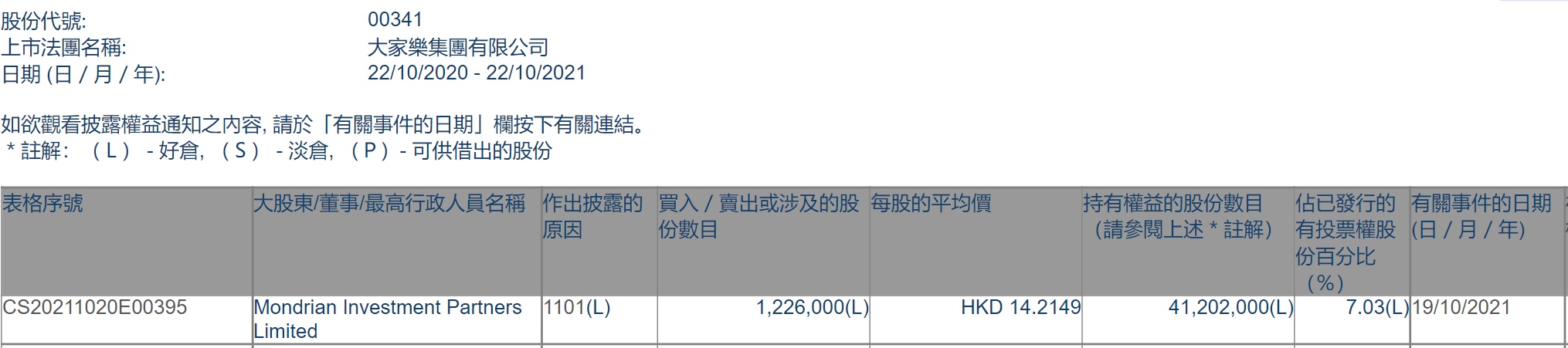 智通财经APP获悉,香港联交所最新资料显示,10月19日,Mondrian Investment Partners Limited增持大家乐(00341)122.6万股,每股作价14.2149港元,总金额约为1742.75万港元。增持后最新持股数目约为4120.2万股,最新持股比例为7.03%。