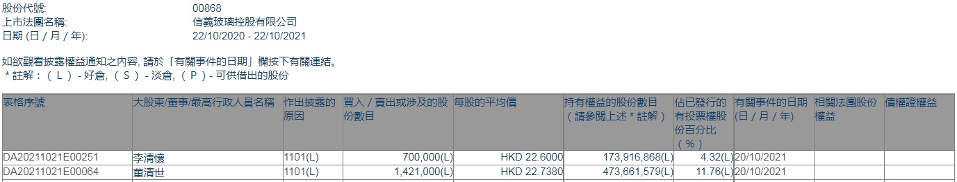 智通财经APP获悉,香港联交所最新资料显示,10月20日,执行董事董清世增持信义玻璃(00868)142.1万股,每股作价22.738港元,总金额约为3231.07万港元。增持后最新持股数目约为4.74亿股,最新持股比例为11.76%。