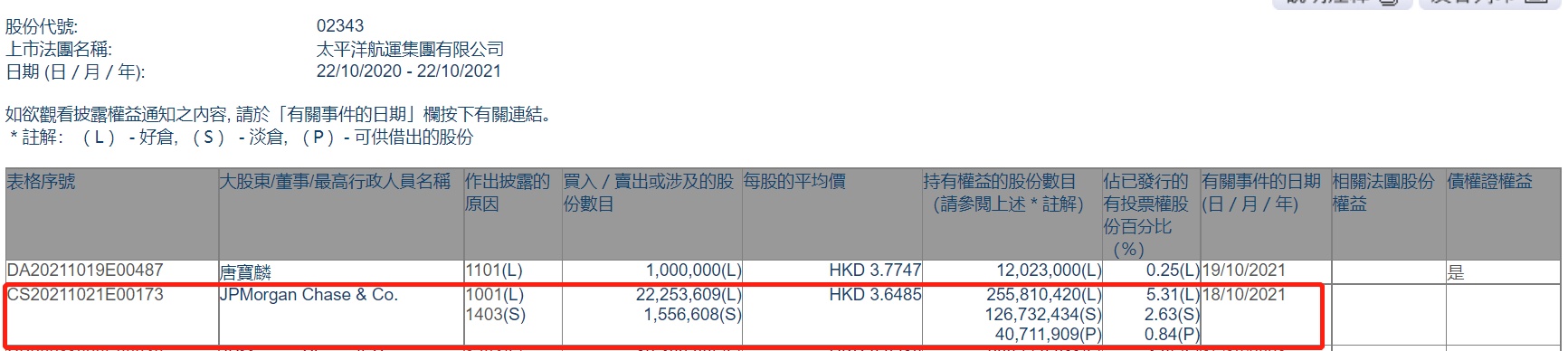 智通财经APP获悉,香港联交所最新资料显示,10月18日,小摩增持太平洋航运(02343)2225.3609万股,每股作价3.6485港元,总金额约为8119.23万港元。增持后最新持股数目约为2.56亿股,最新持股比例为5.31%。