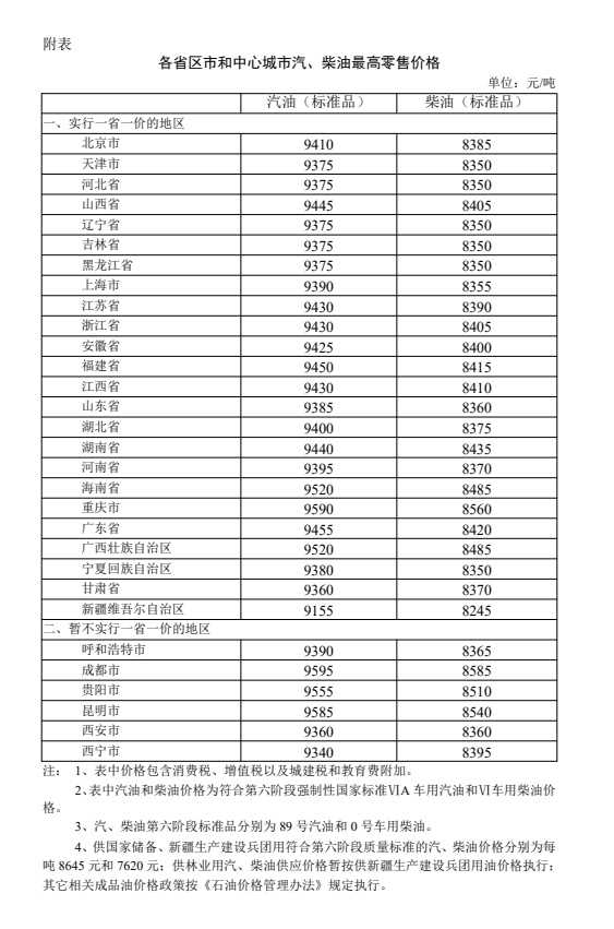 附:各省区市和中心城市汽、柴油最高零售价格