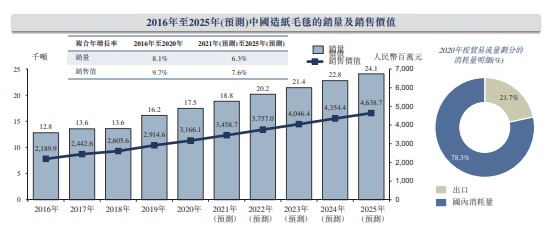 2016至2020年,我国造纸毛毯的销量从12820.1吨增长至17487.9吨,复合年增长率达到8.1%。其销售价值由21.90亿元增长至31.66亿元,复合年增长率为9.7%。预计2021至2025年这两项复合年增长率有望达到6.3%以及7.6%,继续维持稳定涨幅。