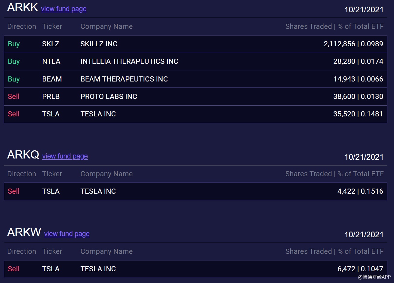 如上图所示,伍德旗下几个基金在21日共出售了46414股特斯拉的股票,价值约4150万美元。而就在不久前,她刚刚卖出了价值2亿美元的特斯拉股票。据报道,伍德曾在上个月的一次会议上表示,她愿意出售其旗舰基金ARKK持有的特斯拉股份。