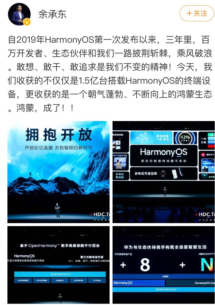 智通财经APP获悉,10月23日,华为常务董事余承东在微博上宣布,“自2019年HarmonyOS第一次发布以来,三年里,百万开发者、生态伙伴和我们一路披荆斩棘,乘风破浪。敢想、敢干、敢追求是我们不变的精神!今天,我们收获的不仅仅是1.5亿台搭载HarmonyOS的终端设备,更收获的是一个朝气蓬勃、不断向上的鸿蒙生态。鸿蒙,成了!”