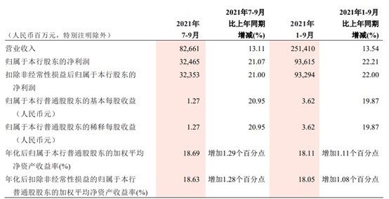 除了招商银行以外,A股市场中,平安银行、杭州银行和常熟银行已相继发布2021年第三季度报告,业绩表现亮眼。其中,平安银行前三季度净利润增速高达30.1%,目前领跑上市银行;杭州银行和常熟银行的净利润增速处于两位数水平,分别达到19.97%、12.96%,盈利能力改善显著。