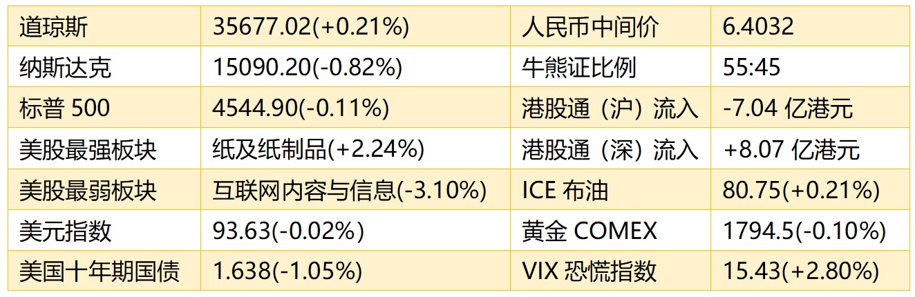 1、 隔夜美股截至收盘,道指涨73.94点或0.21%,报35677.02点;纳指跌125.50点或0.82%,报15090.20点;标普500指数跌4.88点或0.11%,报4544.90点。上周道指上涨1.08%,标普500指数上涨1.64%,纳指上涨1.29%。上周五早间,道指最高上涨至35765.02点,创盘中历史高位。港股ADR指数上涨,按比例计算,收报26250点,涨123.54点或0.47%。