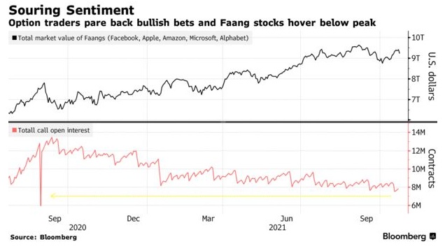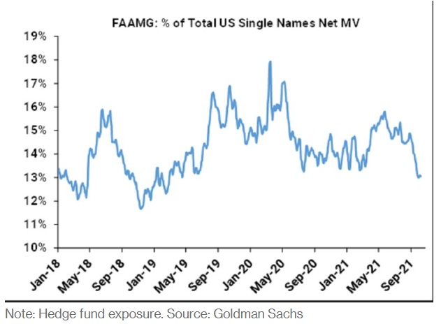 据高盛的主要经纪商表示,过去一个月,对冲基金对美国五大科技公司FAAMG的敞口有所下滑,达到两年多来的最低水平。与此同时,那些涌入市场、押注2020年快速上涨的期权交易员也正在撤退,根据汇编数据显示,市场对这五只科技股的未平仓看涨合约已降至14个月低点。