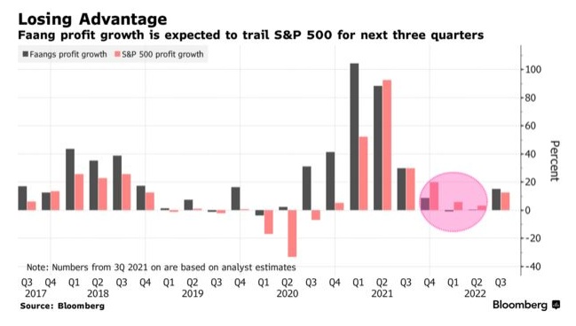 截至2022年6月的每个季度,FAAMG的利润增长预计都将落后于整体市场。分析师估计,目前这一差距将达到11个百分点,为近五年来最差表现。