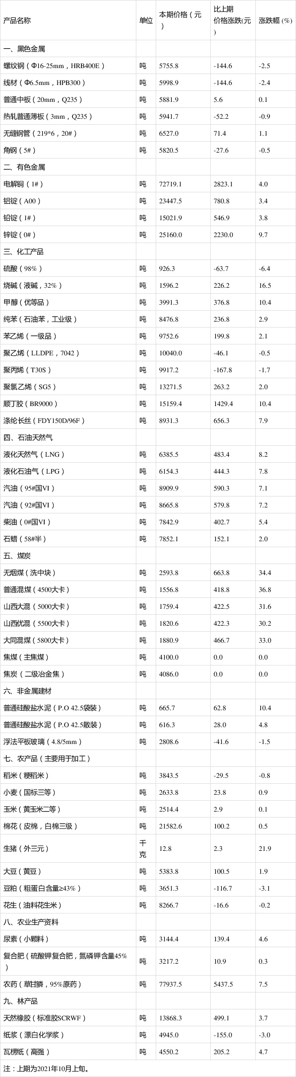 2021年10月中旬流通领域重要生产资料市场价格变动情况