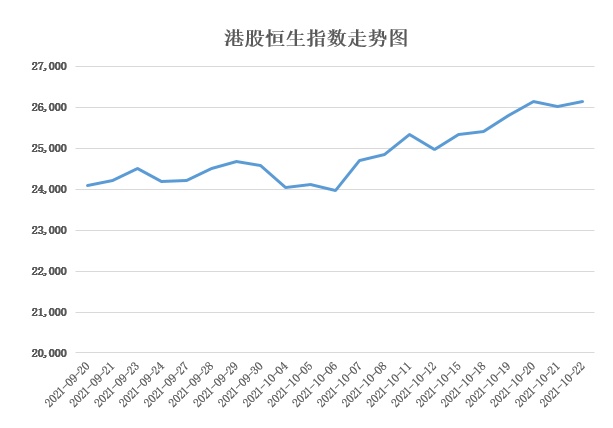 随着反垄断等一系列监管举措“靴子落地”,利空释放,港股市场正触底反弹。在10月第三周的最后一个交易日,香港恒生指数高开97点,最终收报26126点,升幅0.42%,主板成交1243亿港元,延续本周的涨势。至此,恒指已实现连续四周上涨。