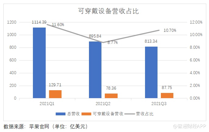 近些年来,随着苹果可穿戴设备产品矩阵丰富度的增加, 该业务带来的营收不断增长,由 2015财年Q2的16.89亿美元(营收占比为 3%)提升至2021财年Q3的87.75 亿美元(营收占比为 10.7%),成为苹果第三大业务(按营收计算)。