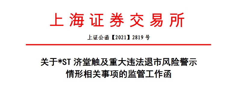 智通财经APP获悉,10月24日,上交所向*ST 济堂(600090.SH)发出*ST 济堂触及重大违法退市风险警示情形相关事项的监管工作函。监管工作函指出:2021年10月24日,公司公告称,收到中国证监会《行政处罚及市场禁入事先告知书》(处罚字【2021】90 号)。根据事先告知书,公司2017年度至2019年度虚增净利润,扣除虚增净利润后,公司2017年至2020年连续四年净利润为负。根据《关于发布上海证券交易所股票上市规则(2020 年 12 月修订)的通知》(上证发【2020】 100 号)、《上市公司重大违法强制退市实施办法》等相关规定,公司实际可能触及重大违法强制退市情形。上交所提出:要求上市公司做好信息披露工作。上交所将在披露日后15个交易日内作出是否终止公司股票上市的决定。