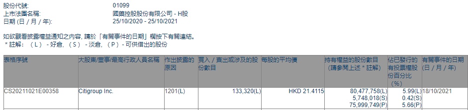 智通财经APP获悉,香港联交所最新资料显示,10月18日,花旗减持国药控股(01099)13.332万股,每股作价21.4115港元,总金额约为285.46万港元。减持后最新持股数目约为8047.78万股,最新持股比例为5.99%。