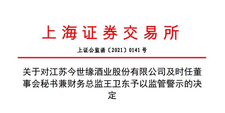 智通财经APP获悉,10月25日,上交所发布关于对江苏今世缘酒业股份有限公司(603369.SH)及时任董事会秘书兼财务总监王卫东予以监管警示的决定。经查,公司未及时披露闲置自有资金委托理财事项。时任董事会秘书兼财务总监王卫东(2014 年3月1日至今)作为公司信息披露事务的具体负责人,未能勤勉尽责,对公司违规行为负有责任。