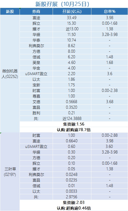 智通财经APP获悉,微创机器人(02252)、三叶草(02197)正在招股中。截至10月25日,富途、耀才、辉立、华盛等合计分别为其借出孖展近124.3888亿港元、2.9756亿港元。其中,微创机器人超购逾78.7倍,三叶草超购逾0.46倍。