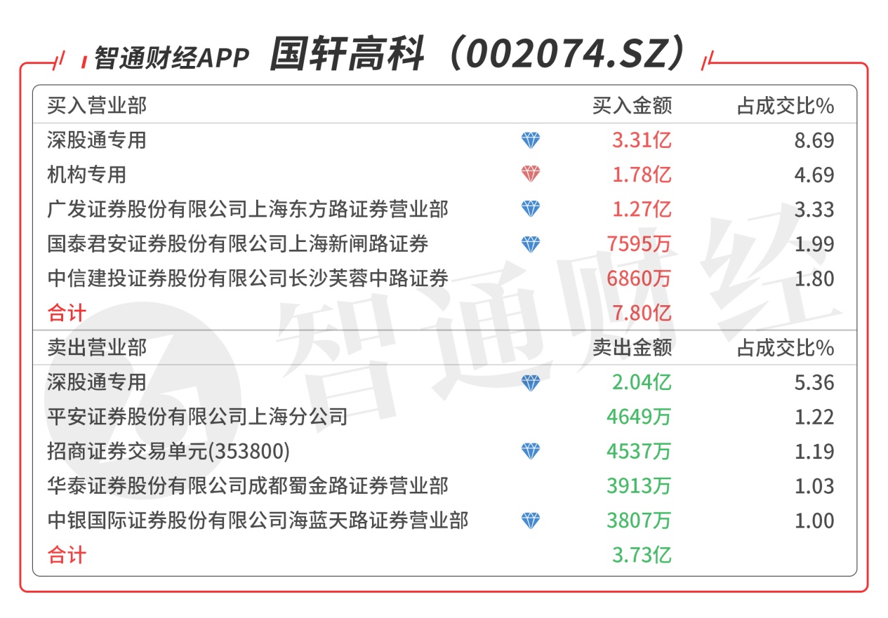 国轩高科(002074.SZ):龙虎榜阵容强大,深股通对倒当日净买入1.27亿元,机构席位买入1.78亿元,买三是知名游资的席位买入1.27亿元,买四是知名游资的席位买入7595万元,当日净买入4.12亿元,该股今日突破60日线强势涨停,要突破前期高点65.98元,主要看板块效应能否持续发酵。