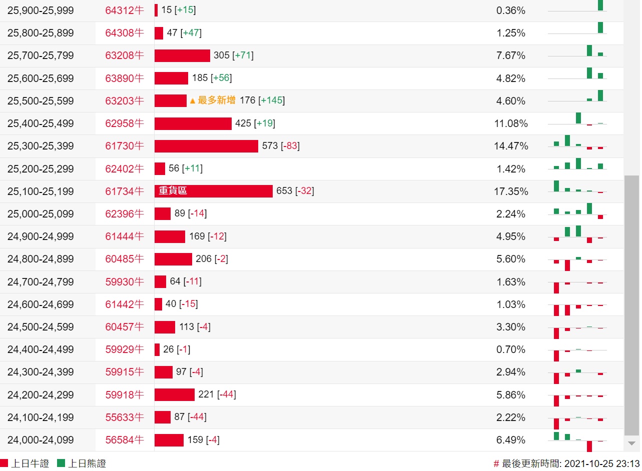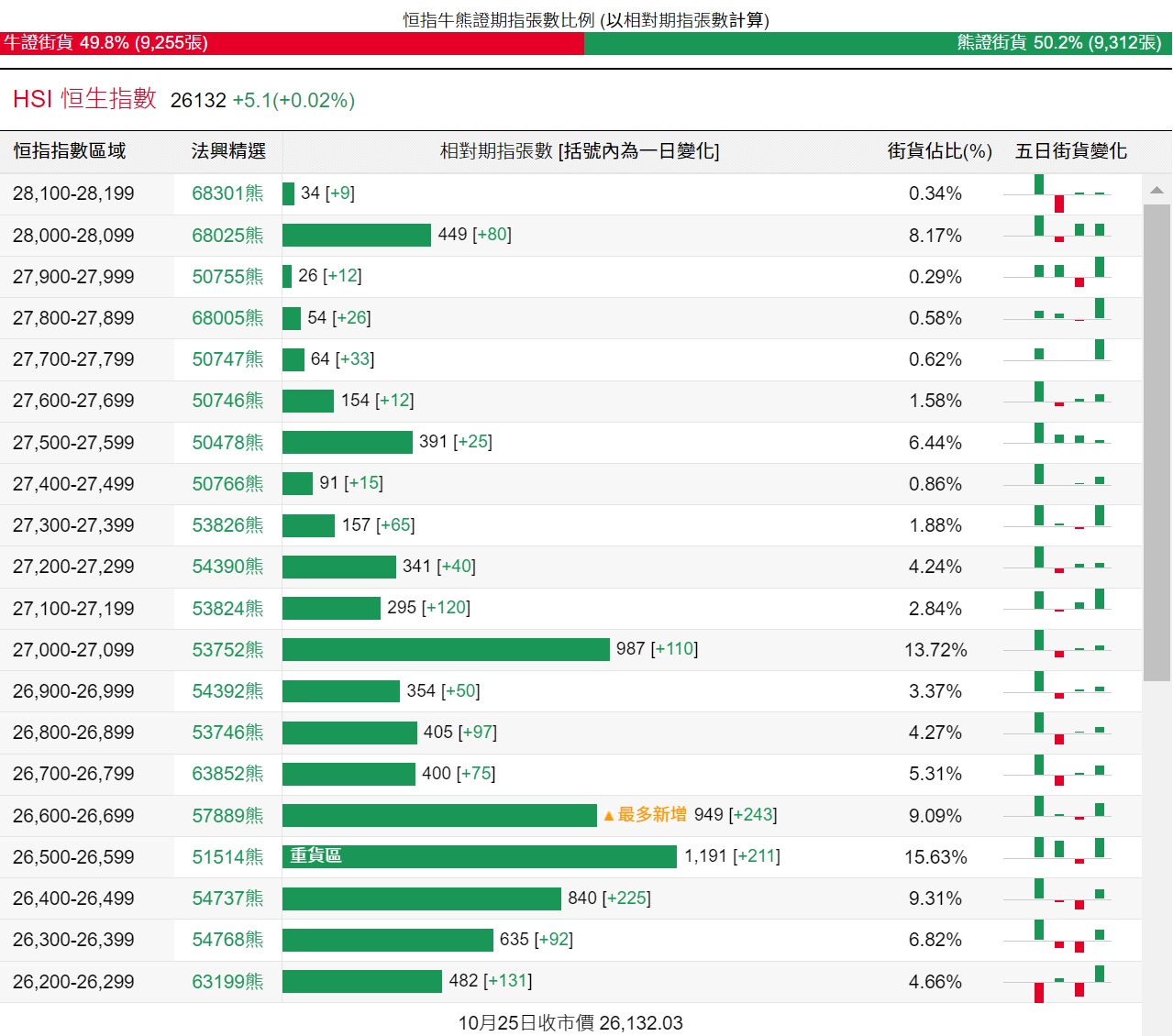 法兴恒指牛熊证街货分布图中的数据显示,熊证街货重货区在26,500-26,599区间,该区间最新熊证数量为1191张,较上一交易日增加211张;最多新增在26,600-26,699区间,该区间最新熊证数量为949张,较上一交易日增加243张。