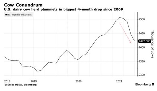 因此,牛奶产量下降可能意味着奶制品价格会上升,并加剧已经冲击了美国的食品通胀。