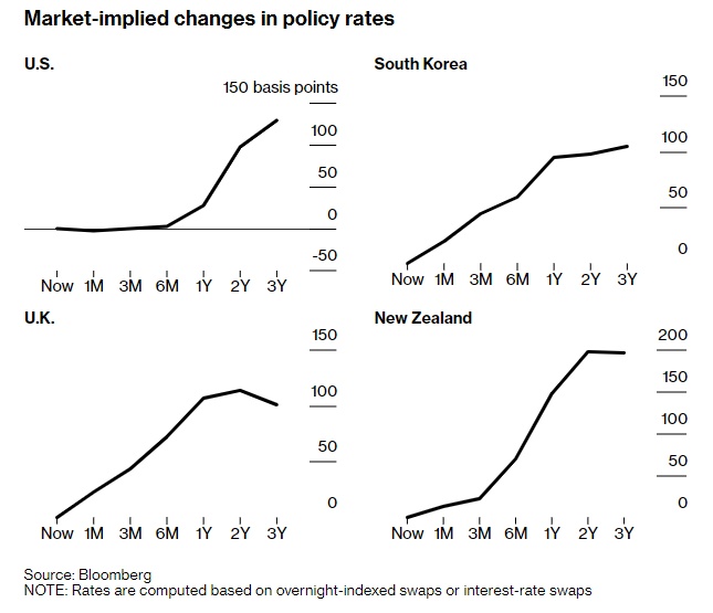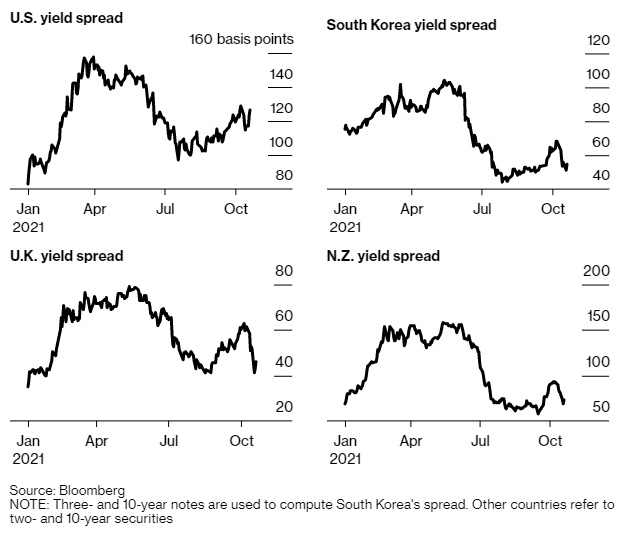 交易员们押注英国、新西兰和韩国等国在生活成本和大宗商品价格飙升的情况下,明年最多将加息158个基点。然而,收益率曲线趋平(历来被视为市场对经济健康状况的评估)表明,市场愈发担心利率如此迅速的上升将损害刚刚开始的经济复苏。