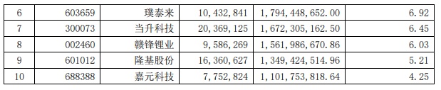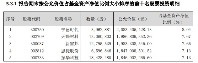 具体而言,该基金三季度大幅增持宁德时代至396.29万股,依旧为第一大重仓股。天赐材料(002709.SZ)、新宙邦(300037.SZ)、振华科技(000733.SZ)、璞泰来(603659.SH)、当升科技(300073.SZ)、赣锋锂业(002460.SZ)均遭减持,恩捷股份(002812.SZ)、隆基股份(601012.SH)获增持;嘉元科技(688388.SH)新进为前十大重仓股,应流股份(603308.SH)前十大重仓股行列。