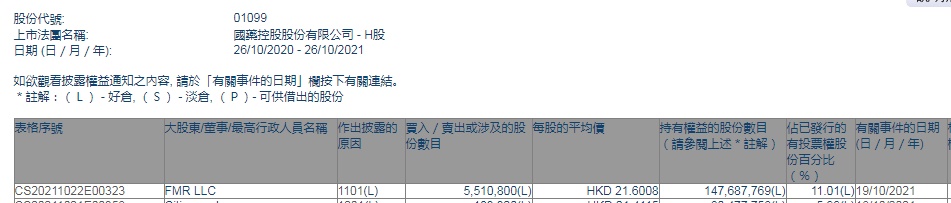 智通财经APP获悉,香港联交所最新资料显示,10月19日,FMR LLC增持国药控股(01099)551.08万股,每股作价约21.6008港元,总金额约为1.19亿港元。增持后最新持股数目约为1.48亿股,最新持股比例为11.01%。