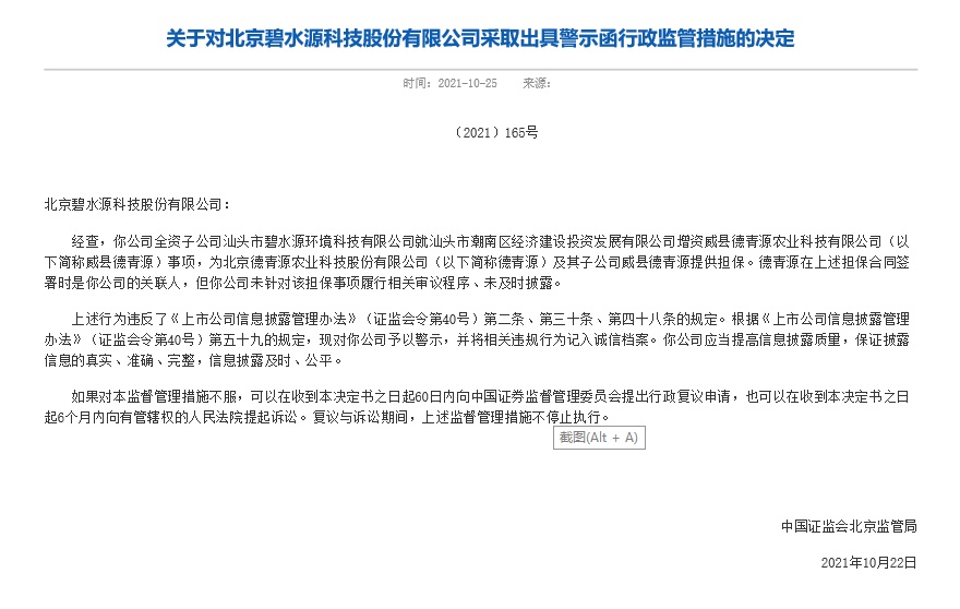 智通财经APP获悉,10月26日,证监会对北京碧水源科技股份有限公司(碧水源,300070.SZ)采取出具警示函行政监管措施的决定。经查,碧水源全资子公司汕头市碧水源环境科技有限公司就汕头市潮南区经济建设投资发展有限公司增资威县德青源农业科技有限公司(以下简称威县德青源)事项,为北京德青源农业科技股份有限公司(以下简称德青源)及其子公司威县德青源提供担保。德青源在上述担保合同签署时是碧水源的关联人,但碧水源未针对该担保事项履行相关审议程序、未及时披露。