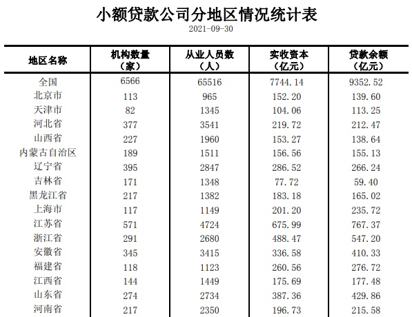 智通财经APP获悉,10月26日,央行发布2021年三季度小额贷款公司统计数据报告。截至2021年9月末,全国共有小额贷款公司6566家。贷款余额9353亿元,前三季度增加488亿元。
