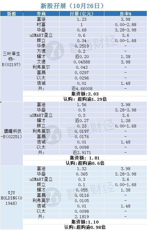 智通财经APP获悉,三叶草生物-B(02197)、鹰瞳科技-B(02251)、UJU HOLDING(01948)正在招股中。截至10月26日,富途、耀才、辉立、华盛等合计分别为其借出孖展近4.66008亿港元、近2.9171亿港元、2.1819亿港元。其中,三叶草生物-B超购逾1.29倍,鹰瞳科技-B超购逾0.6倍,UJU HOLDING超购逾0.98倍。