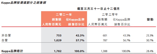 收入结构来看,2021财年里中国动向超过9成的收入来自于Kappa品牌,期内该业务收入增速为28.4%,基本与公司整体收入增速保持一致。换言之,Kappa品牌的表现决定了中国动向的业绩走势。进一步细分,期内公司Kappa品牌自营渠道和非自营渠道双双放量,对应销售额增速分别达到25.3%、30.7%。