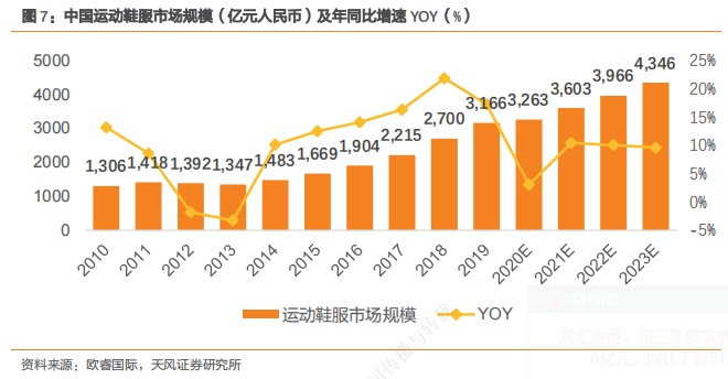 两家企业业绩“携手”高增,一个重要的背景是国内运动鞋服市场在后疫情时代延续高景气度、高增速,尤其是头部品牌竞争优势显著。据公开数据,国内运动鞋服行业2021年整体规模预计达到3603亿元,同比增速有望保持在10.43%,2021年-2023年期间行业复合年增长率有望达到9.83%,是服装板块里复合增速最快的细分市场之一。