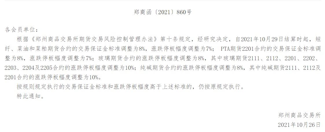 智通财经APP获悉,郑商所于10月26日发布公告表示,经研究决定,自2021年10月29日结算时起,短纤、菜油和菜粕期货合约的交易保证金标准调整为8%,涨跌停板幅度调整为7%; PTA期货2201合约的交易保证金标准调整为8%,涨跌停板幅度调整为7%;玻璃期货合约的涨跌停板幅度调整为8%,其中玻璃期货2111、2112、2201、2202、2203、2204及2205合约的涨跌停板幅度调整为10%;纯碱期货合约的涨跌停板幅度调整为8%,其中纯碱期货2111、2112及2201合约的涨跌停板幅度调整为10%。按规则规定执行的交易保证金标准和涨跌停板幅度高于上述标准的,仍按原规定执行。