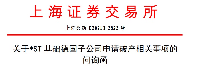 智通财经APP获悉,10月26日,上交所向*ST基础(600515.SH )发出问询函。问询函指出:该公司于10月26日发布公告,称子公司德国海航机场集团及其下属 4 家子公司于近期向德国地方法院申请破产,法院已裁定受理相关破产申请。相关机场公司系年初自关联方收购,现申请破产对中小投资者影响较大。上交所要求*ST基础及相关方补充披露“关于前期收购决策是否审慎合理、申请破产具体原因、补贴诉讼的具体情况及收购及申请破产对公司的具体影响”等事项。