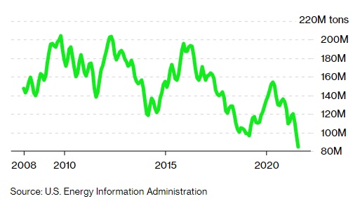 美国电力生产商今年的煤炭消耗量预计将增加19%,矿商多年来一直在限制产能,这将把2021年的产量增幅限制在10%以下,使化石燃料储备消耗加快,并加剧了对冬季供应的担忧。