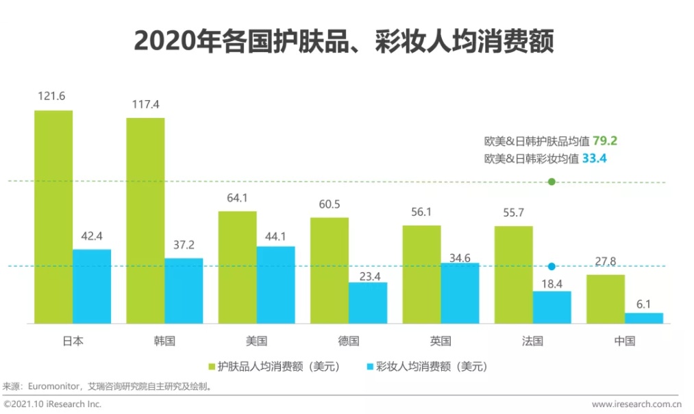 然而,中国美妆市场人均消费仍有较高的增长空间。2020年中国为世界第二大美妆市场,护肤和彩妆产品的人均消费额仅为欧美与日韩等发达国家的1/3和1/5,远低于国际水平。