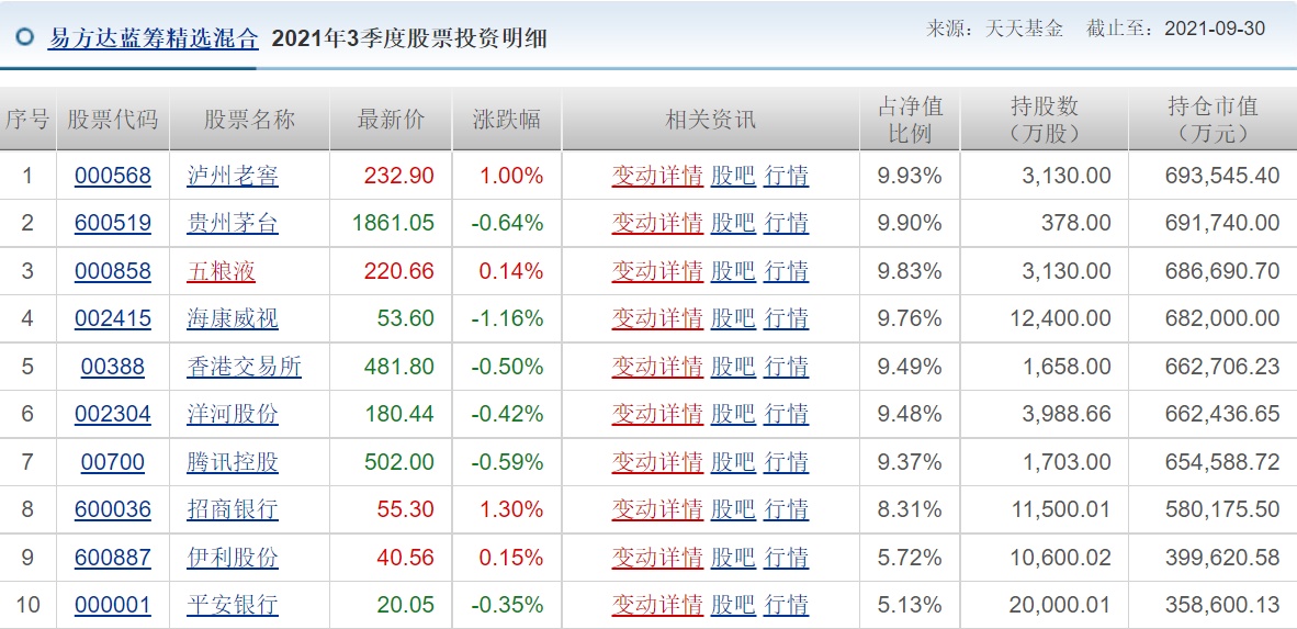其中,易方达蓝筹精选混合前三大重仓股分别为泸州老窖(000568.SZ)、贵州茅台(600519.SH)、五粮液(000858.SZ)。该基金增持泸州老窖(000568.SZ)至3130万股,并增持海康威视(002415.SZ)、招商银行(600036.SH)等股票;伊利股份(600887.SH)、平安银行(000001.SZ)新进该基金前十大重仓股。