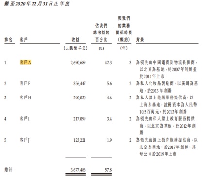 其中,公司的五大客户包括电商公司、互联网服务公司、在线游戏公司及化妆品公司、在线教育公司、软件开发公司以及旅行休闲公司。近三年来一直为客户A提供线上营销解决方案,客户A亦为公司的最大客户。据招股书表述,客户A为中国领先的电商供应商——京东。2018年、2019年及2020年,优矩互动来自客户A的收入占比为25.4%、24.5%及42.3%。