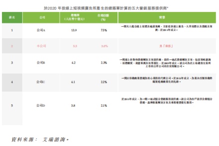 在线短视频平台行业经历了高速发展并还将继续,但因该行业为新兴行业,短视频平台营销服务市场潜力仍在挖掘,所以行业营销服务环节尚未出现主导者。数据显示,按2020年投放在在线媒体平台的在线短视频广告产生的总账单计,前五大营销服务提供商的市场份额仅为17.1%,其中,排名第二的优矩互动市场份额为3.0%。