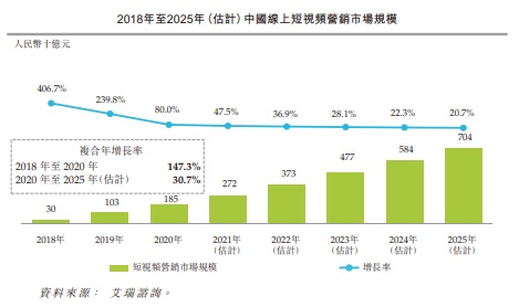 智通财经APP了解到,受在线短视频平台的快速增长及在线短视频内容的日益普及所带动,中国短视频营销市场快速增长。据艾瑞咨询的资料,按占在线营销市场的市场规模的百分比计算,在线短视频营销的市场份额已由2015年的0.1%大幅增至2020年的24.1%,预计2025年将进一步增至42.5%。按在线短视频总账单计,中国在线短视频营销市场的市场规模由2018年的302亿元大幅增至2020年的1846亿元,期内复合年增长率高达147%,预计2025年将进一步增长至7043亿元,期内复合增长率为30.7%。