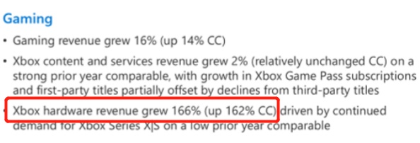 微软本财季游戏业务同比增长16%,其中Xbox内容和服务营收保持相对平稳,增长2%。Xbox硬件端业务营收增长幅度达到166%,远超出市场预期。微软表示,主要受Xbox Series X/S需求增长的持续推动以及低基数效应。