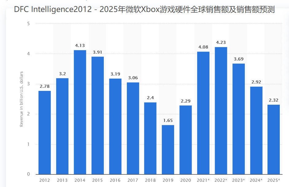 根据DFC Intelligence统计及预测数据,预计2021年全年Xbox游戏硬件销售额将达到40.8亿美元,并且DFC还预计该游戏硬件销售额将在2022年达到峰值。