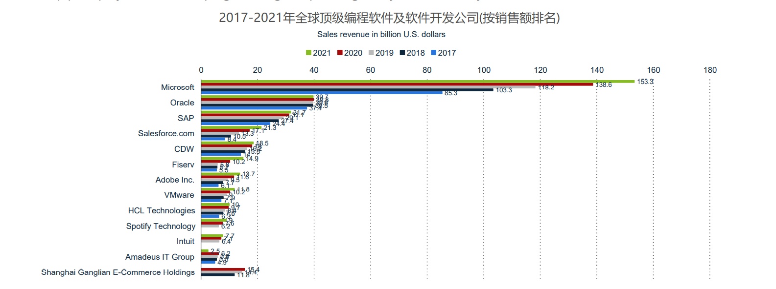 根据Statista提供的最新统计数据,近几年微软仍然是“软件及编程开发”领域的绝对统治者。微软以Office系列、Windows和Linkedln等传统优势软件为基础稳扎稳打,同时加快布局低代码、大数据和云计算等新兴领域,在软件开发市场绝对是名副其实的“最强王者”。
