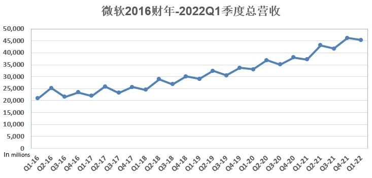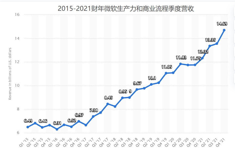 在Office系列产品的推动下,2022财年第一季度生产力和商业流程营收同比增长22%至150.39亿美元,超越上季度创下的历史高点。