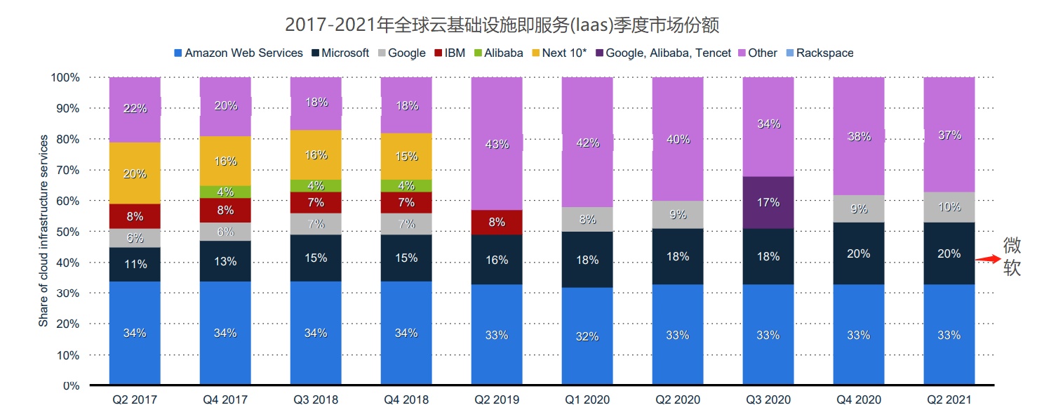 在云赛道最基础也是最核心,同时还是壁垒最高、盈利水平最高的Iaas领域,微软Azure近几年已经实现了“后发制人”,市场份额在与其它大型云平台的白热化竞争中不断提升,挡在前面的目前只有AWS这座大山。