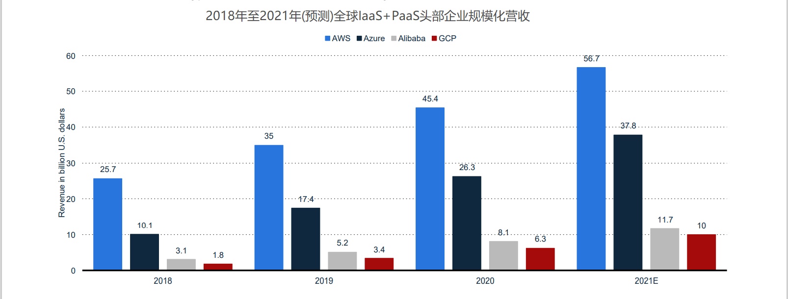 AWS依然占据绝大多数该领域市场份额,根据Statista提供的2021年Iaas+Paas营收预测数据,AWS仍然一绝骑尘。