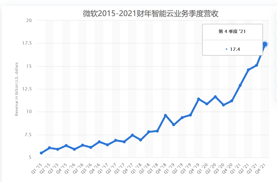 随着“企业上云”成为全球企业转型的重点布局领域,微软智能云业务在此趋势之下一路高歌猛进,可以说是近几年来微软业绩增长的主要力量。