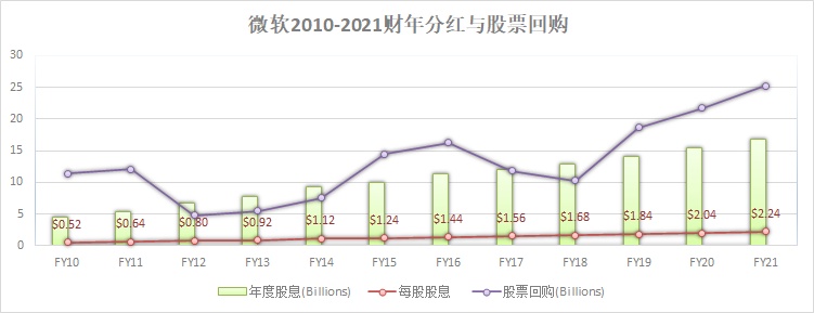 而在派息分红和股票回购方面,微软从不吝啬,非常大手笔。两项指标总体来看也是在不断提高,微软在9月宣布董事会已批准一项高达600亿美元的股票回购计划,并将季度股息由每股56美分提高至62美分,提高幅度达11%。