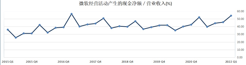 在经营现金流方面,微软2022财年Q1经营活动产生的现金净额为245.40亿美元,同比增长27%,占营收比重为54%,超出上季度的水平。这一比例越高,不仅意味着企业有更多资金用于研发等支出,还意味着该年度股息率及股票回购金额可能就越高,股东收益率也随之提高。