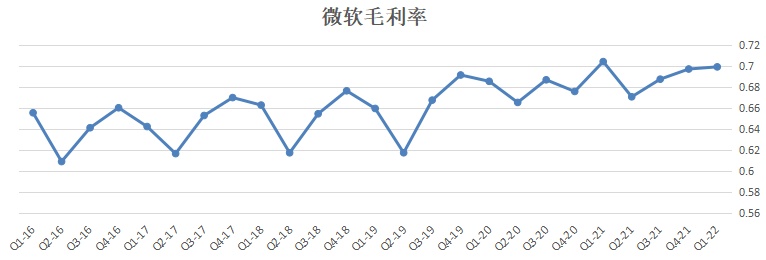 微软Q1毛利润为316.71亿美元,同比增长21%,毛利率为70%,同比小幅下滑不到1个百分点。营业利润率站稳40%,同时毛利率站上70%的高水平,称微软是科技股中的大型“印钞机”也不过分。