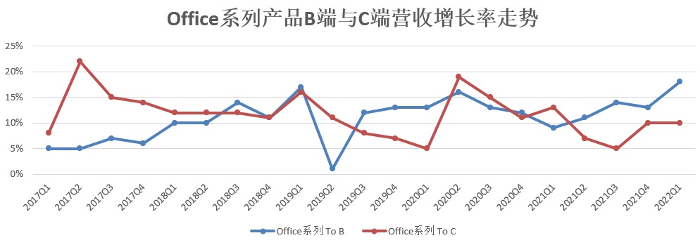作为微软的“金字招牌”,也是微软生产力和商业流程营收这一业务的主要力量——Office系列产品,2022财年第一季度B端营收同比增长了14亿美元,同比增幅达到18%,增幅达到新高。